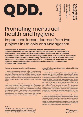 Menstrual health and hygiene is a global issue affecting nearly 500 million people. Despite being on the international agenda, there is still a lack of data to identify effective levers for promoting access. This article presents the results of evaluations of two innovative projects carried out in Madagascar and Ethiopia. Using an integrated approach, these projects addressed access to menstrual products, infrastructure, and the fight against stigma. The evaluations present convergent results and demonstrate the effectiveness of the approach, as well as the central role of psychosocial dimensions. In addition to producing data, they call for strengthening the dialogue between research and public policy, as well as coordination between the various stakeholders, with a view to scaling up.
