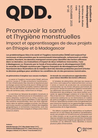 L’accès à la santé et à l’hygiène menstruelles (SHM) est un enjeu mondial qui touche près de 500 millions de personnes. Malgré son inscription à l’agenda international, les données manquent encore pour identifier des leviers efficaces dans ce domaine . Cet article présente les résultats d’évaluations de deux projets innovants, menés à Madagascar et en Éthiopie. En adoptant une approche intégrée, ces projets ont agi à la fois sur l’accès aux produits menstruels, les infrastructures et la lutte contre la stigmatisation. Les évaluations présentent des résultats convergents et démontrent l’efficacité de l’approche, ainsi que le rôle central des dimensions psychosociales. Outre la production de données, elles invitent à renforcer le dialogue entre recherche et politiques publiques, ainsi que la coordination entre les différentes parties prenantes, dans une perspective de passage à l’échelle.